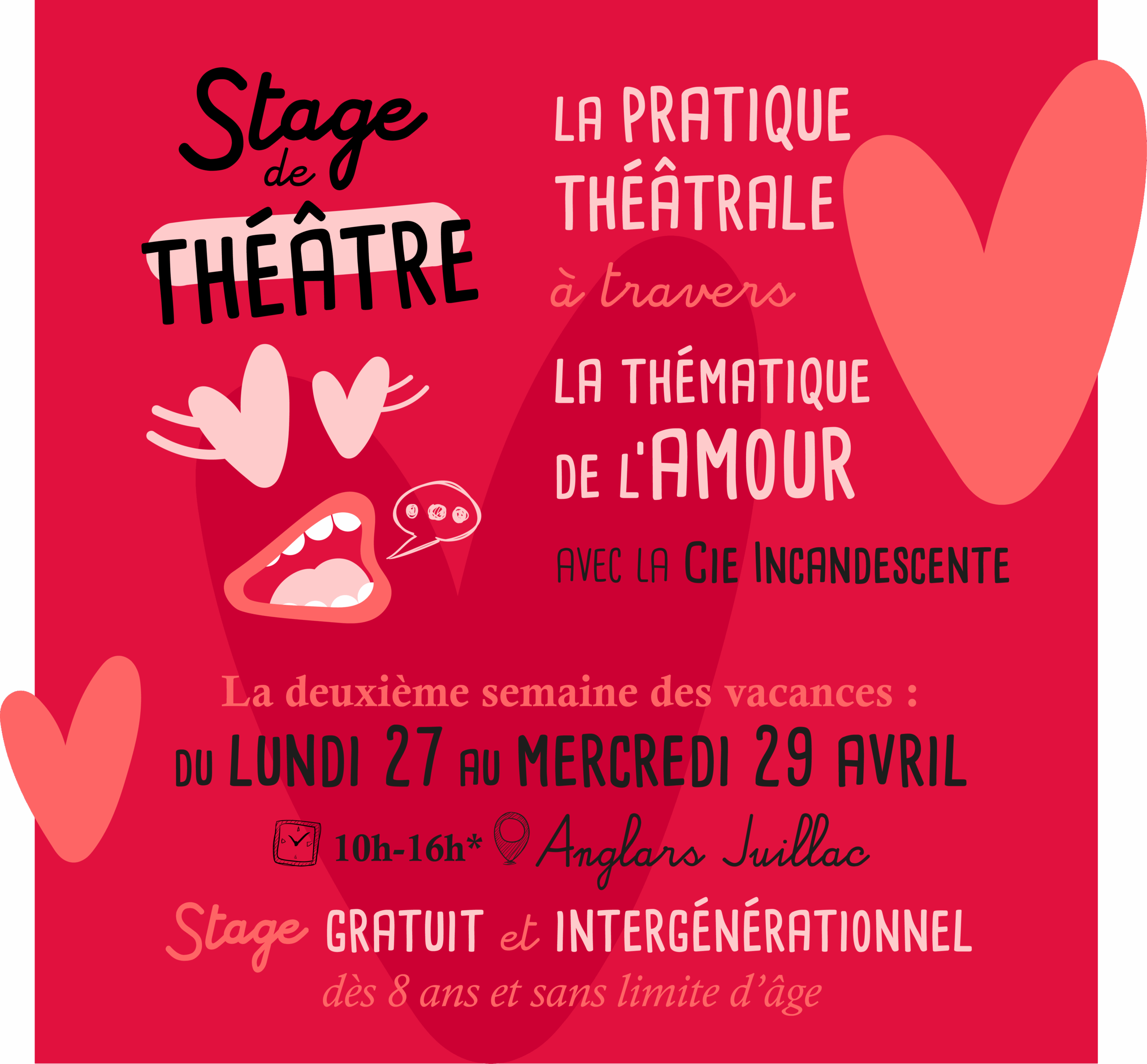 Pendant trois jours, du lundi 27 au mercredi 29 avril 2026, nous accueillons la compagnie toulousaine Incandescente pour un stage de théâtre amateur ouvert à toutes et tous (dès 8 ans et sans limite d’âge) entièrement gratuit. Ce sera l’occasion d’explorer la pratique théâtrale à travers une grande thématique universelle : L’AMOUR.
